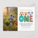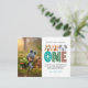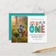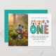 Un garçon moderne et branché pour le premier anniversaire merci carte postale. Design avec des animaux de la jungle et numéro un dans des lettres colorées tendance, message de remerciement et une photo.