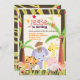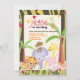 PixDezines jungle theme for a fun birthday bash. Featuring baby animals, pink hippo, a purple elephant, yellow polka dots giraffe, tiger cub as well as a cheeky little brown monkey riding on an elephant head. Zebra print is a finishing touch on the background.