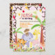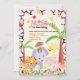 PixDezines jungle theme for a fun birthday bash. Featuring baby animals, pink hippo, a purple elephant, yellow polka dots giraffe, tiger cub as well as a cheeky little brown monkey riding on an elephant head. Zebra print is a finishing touch on the background.