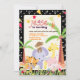 PixDezines jungle theme for a fun birthday bash. Featuring baby animals, pink hippo, a purple elephant, yellow polka dots giraffe, tiger cub as well as a cheeky little brown monkey riding on an elephant head. Zebra print is a finishing touch on the background.