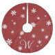 Cette jupe d'arbre est accentuée avec votre monogramme familial sur un arrière - plan rouge classique couvert de flocons de neige.