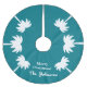 Jupe de Noël tropicale personnalisée avec palmiers. bleu turquoise ou arrière - plan de couleur personnalisé. Luxes élégantes Décorations de vacances pour un emplacement exotique chaleureux près de la plage ou de l'océan. Ajoutez votre propre nom de famille personnalisé et des Joyeuses Fêtes comme Joyeux Noël, Mele Kalikimaka ou Joyeux Vacances ! Accessoires x-mas tendance et décor maison pour maison ou bureau.