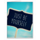 a chalkboard with the text just be yourself written in it against the blue sky, slight vignette added | Bigstock® - All Rights Reserved.