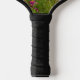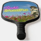 Standout on the court with this fun pickleball paddle that mixes a variety of elements : a vintage tinted photo cutout of an angel / fairy on background of blue skies and flowers with neon pink and yellow "just breathe"