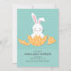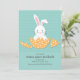 A cute birth announcement featuring a white bunny hatching out of a gold, polkadot egg with a teal, heart-patterned background.