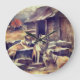 A watercolor painting of three wolves just watching as time goes on two are laying one is sitting there is a old ran down cabin by them. There is a touch of old and aged in this artwork.
