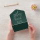 This all-in-one minimalist wedding invitation features elegant typography on an emerald green background. The invitation includes a perforated RSVP card with your wedding website QR code. Designed by Thisisnotme©