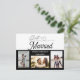 Featuring simple, modern, casual script typography that says "Just Married" (add your names/wedding date), with three photos arranged on the front and a short message on the back. A budget-friendly way to let friends and family know about your elopement or that you are just married. Includes return address to make snail mailing easier. Trendy black and white design.