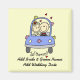 A customizable Just Married wedding magnet featuring a bride and groom stick figure in the wedding car, text that reads "Just Married!" and a place you can easily add the bride and groom's names and wedding date!