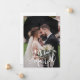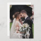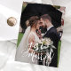 Modern and elegant wedding announcement template card featuring a white hand lettered typography overlay text with swirls that says "Just Married" with your names. Customize this product by adding two pictures. One of the photo will go on the back of the card with your wedding and thank you message.
