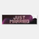 Customizable bumper sticker for recently married couple with glittering "Just Married" text design on pink jewel-like flashy letters and silky purple background.