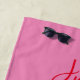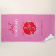Contemporary, modern, vibrant red and pink wedding beach towel gift for newlyweds with monogram - initials, names, date, place, unique romantic love couple birds drawing and trendy handwritten calligraphy script. Just Married!