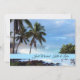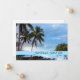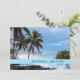Just Married photo card shown with a photo print of a beautiful beach in Hawaii with custom sample names shown, customize this card and change the photo to yours, change the text to yours, you can even put a message on the back.