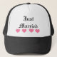 Display your newly married status with this trucker hat with traditional wedding text and pink hearts. See our store for matching items, and wedding party attire!