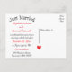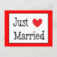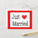 This fun wedding postcard features a Just Married wedding announcement printed in a bold black heart font with a hand drawn red heart highlighted against a crisp white background.