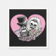 Bride and groom skulls are dressed in their wedding finest with JUST MARRIED text.