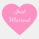 Sticker shown in the heart shape in the pink colour with Just Married text in white.