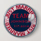 Just Married Team 02-Baseball themed BUTTON-A personalized team button for a couple merging families. The centre is a solid blue background. The outer frame is a red and white striped pattern. Decorative red text circles around the outer frame and reads: JUST MARRIED two times. In the centre is decorative text reads: TEAM and then the clients last name. Established in: your date here. A thrown baseball decorates the top right side of the button. Coordinating Zazzle party supplies is available.