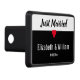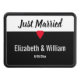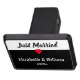 The black script at the top says 'Just Married'. At the bottom, there's white text for the wedding date and the names of the bride and groom. A red heart is between the text.