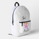 This backpack features a "Just Married!" design with a continuous line drawing of two rainbow swirly hearts (with shadow) linked together.