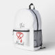 This backpack features a "Just Married!" design with a continuous line drawing of two red swirly hearts (with shadow) linked together.