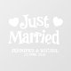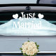 Celebrate your first ride together as a married couple with this romantic Just Married car window cling with hearts.