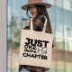 Funny typography quote tote bag for bookworms, that reads: "Just one more chapter".