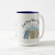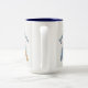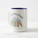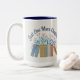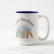 This Two Tone Mug features an illustration of seven hardcover books on a light blue background. The books are in muted colors - blue, turquoise and green, tan, green, light blue, light red and golden brown. Pink wildflowers with green stems and leaves are growing from between the books. The text Just One More Chapter is written in navy blue script at the top of the image, arched to match the curve of the flowers and books. The mug is a navy blue two tone mug with a navy blue interior. The basic mug color is white. The mug is a fifteen ounce mug.