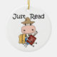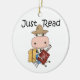 Just Read T-shirts, hoodies, mugs, cards, stickers, buttons, magnets, mousepads, journals, keepsakes, and other reading theme apparel and gifts that promote reading in a cute way! A cow with a straw hat and pitchfork rests against a hay bale with a book!