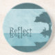 A green-blue textured drawing featuring the silhouette of a man sitting under a tree by a pond contemplating. The word "Reflect" rests on the lake's surface, the text and shadows reflected in the perfectly still water.