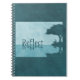 A green-blue textured drawing featuring the silhouette of a man sitting under a tree by a pond contemplating. The word "Reflect" rests on the lake's surface, the text and shadows reflected in the perfectly still water.