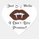 Just Say Hello is an image of deep maroon lips with protruding fangs with additional text that says I Don't Bite Promise.