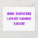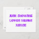 tHIS POSTCARD HAS PURPLE WRITING ON THE FRONT THAT SAYS" JUST SHOWING LOVE!! MUAH!! XOXO!! " PERFECT FOR VALENTINES DAY OR JUST TO SEND SOMEONE UR LOVE THROUGH A POSTCARD!!