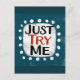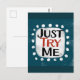 A fun typographic design that says "Just Try Me". It's black and red text on a white rectangle with funky, playful white dots surrounding it, all on a teal background.