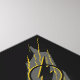 This black and gold graphic has the new Justice League movie logo drawn diagonally with the individual Justice League hero logos grouped to form a counter diagonal stroke.