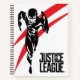 Check out this black and white stylized drawing of Justice League's The Flash as he runs at top speed. This pop art inspired graphic is accented by red dashes trailing behind The Flash.