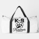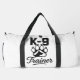 This white Duffel bag is perfect for any K-9 trainer or dog enthusiast, featuring a bold "K-9" graphic above a paw print with a dog silhouette, and the word "Trainer" in a stylish script font. It's an ideal bag for carrying training gear, gym clothes, or essentials for a weekend with your canine companion. Edit colour of the bag caps and body in the Design tool to your favored colours.
