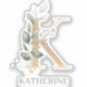 Letter K monogram floral. Letter K in golden brown texture accented with green watercolor compound leaves and berries and melted gold splashes. Personalized with name in matching font.