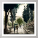 This beautiful minimalist illustration depicts a street scene in Kabul city, with a female and male walking down the road under umbrellas. The male and female figures are drawn with minimal lines, but their postures and the placement of their umbrellas suggest movement and direction.