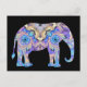 A beautifully patterned kaleidoscope elephant decorates this postcard. The elephant has marbled colours of turquoise, purple, gold, lavender, and white against a black background.