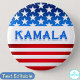 Kamala Harris Presidential Campaign American Flag button. For a Kamala Harris presidential campaign supporter design, a bold and empowering layout that combines typography and patriotic symbols to create a striking visual statement. At the centre of the design, feature Kamala Harris's name in large, elegant typography. Use a modern font to convey a sense of forward-thinking and progress. To enhance the design's visual appeal, add a subtle, polished finish with a shadow effect, giving the typography a sense of depth and dimension. This approach not only highlights Kamala Harris’s name but also ensures the flag’s colours and patterns stand out vibrantly. This product aims to celebrate Kamala Harris’s candidacy with a strong, patriotic flair, using typography and the U.S. flag to create a powerful, supportive statement for her presidential campaign.