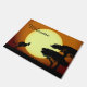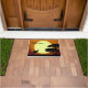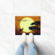 This illustration shows a silhouette of a kangaroo, jumping around in grassland during sunset.