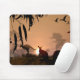 Kangaroos settle down for the night. Cockatoos fly overhead with a blazing sunset behind them. Computer art by Kathie Miller.