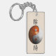 Featuring a motif based on the ancient Taoist Yin-Yang symbol, one half shows Moon's grey surface as seen from Earth and the other half shows a stylized molten sun filled with reds, yellows, and oranges.