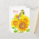 A post card decorated with a western meadowlark bird on a bright blooming sunflower in summer drawn with pen and ink and painted with watercolor. Inspired by the state bird and state flower of Kansas.