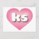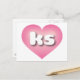 This postcard features a pink heart with a white-washed centre containing the bold, white, rounded lower case letters ks, a playful abbreviation for Kansas, the sunflower state. The reverse side of the postcard is blank, awaiting your customized text or handwritten sentiments.