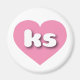 This magnet features a vibrant pink heart containing the bold, white, rounded lower case letters ks, a playful abbreviation for Kansas, the sunflower state.