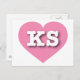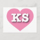 This postcard features a vibrant pink heart containing the bold, white, upper case letters KS, the official abbreviation for Kansas, the sunflower state. The reverse side of the postcard is blank, awaiting your handwritten sentiments or customized text.