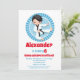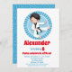 L'invitation pour l'anniversaire de ce garçon comporte un mignon garçon aux cheveux foncés et à la ceinture noire. Sur l'arrière - plan décoratif bleu.
