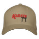 Fits well due to elastic edging, not adjustable. Good qualty material. Good quality embroidering. Subtle lettering (white on beige) just as my wife likes.